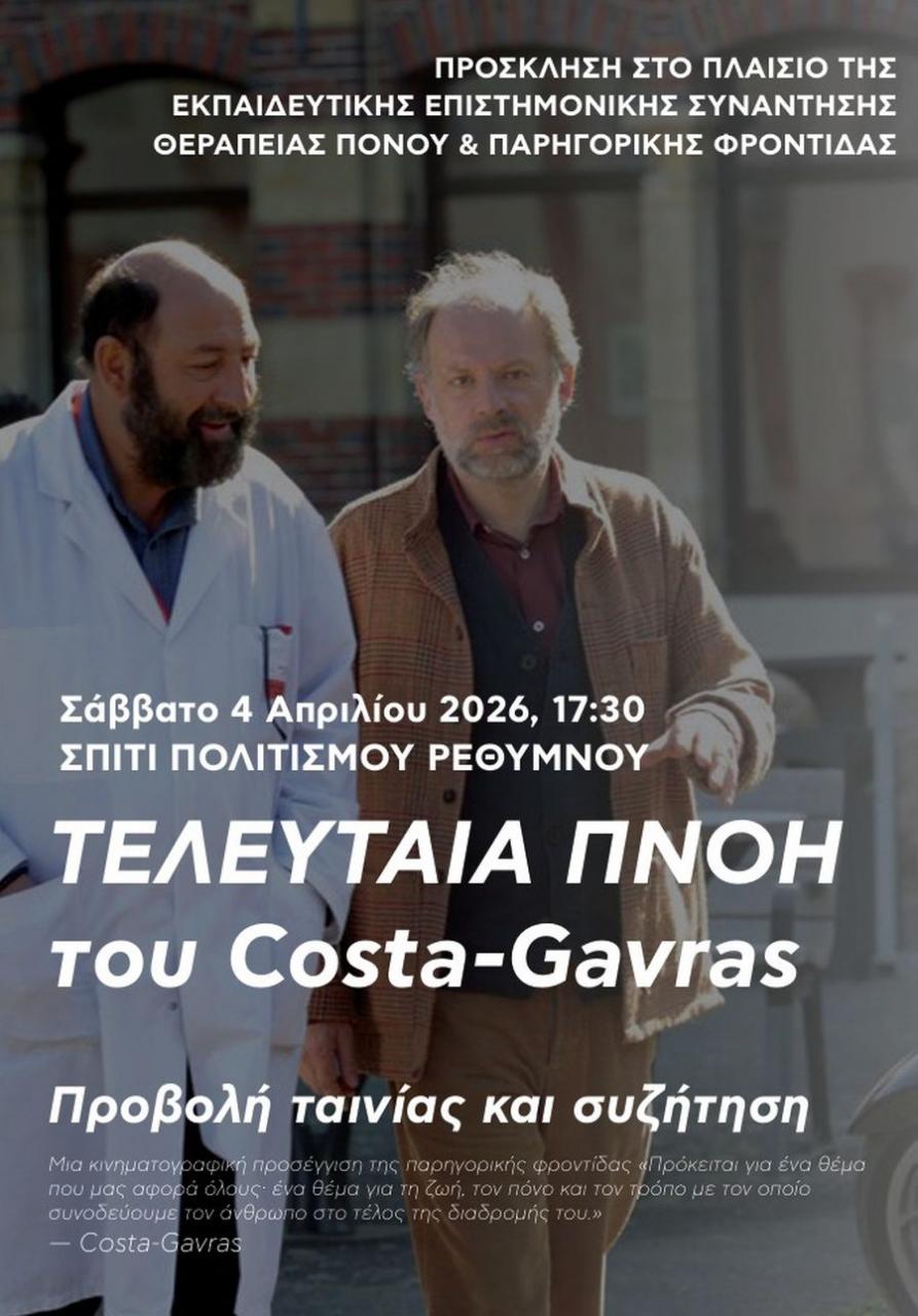 Σπίτι του Πολιτισμού Βερνάδου 10, Ρέθυμνο, Ρεθύμνου, ΕλλάδαΠροβολή της ταινίας του Κώστα Γαβρά «Η τελευταία πνοή» θα πραγματοποιηθεί το Σάββατο 4 Απριλίου στο Σπίτι του Πολιτισμού, στο πλαίσιο του συνεδρίου για την που διεξάγεται στο Ρέθυμνο από 1 - 4 Απριλίου 2026. Η ταινία είναι αφιερωμένη στους ανθρώπους που βρίσκονται στο τέλος της ζωής τους, αναδεικνύοντας την αξία της φροντίδας, της αξιοπρέπειας […]