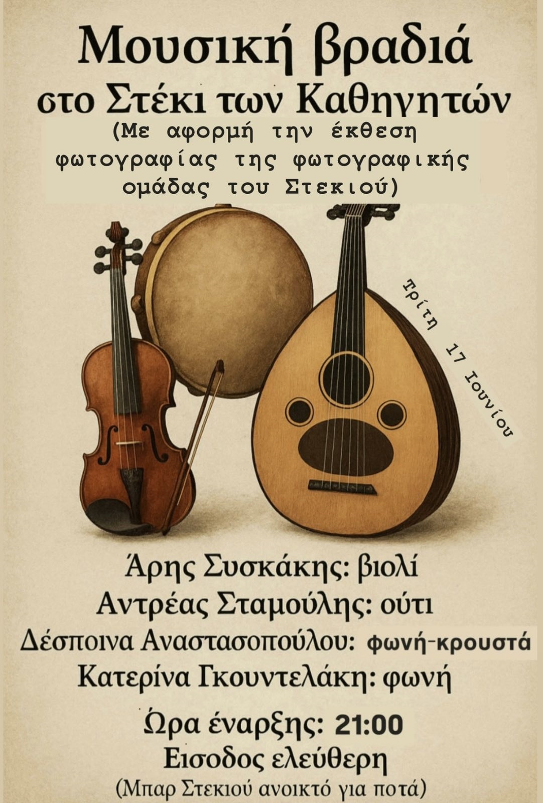 Vibes All Day Coffee & Bar Κουντουριώτου 137, Ρέθυμνο, Κρήτη, GreeceΜουσική βραδιά με τους Σάκη Σακελλρίδη, Μαρία Δασκαλάκη, Μάνο Χουδετσανάκη και Γιώργο Αγγελογιαννάκη στο Vibes All Day Coffee & Bar (Κουντουριώτου 137, Ρέθυμνο). Σάββατο 27 Δεκεμβρίου - Έναρξη 21:30. Τηλ. […]