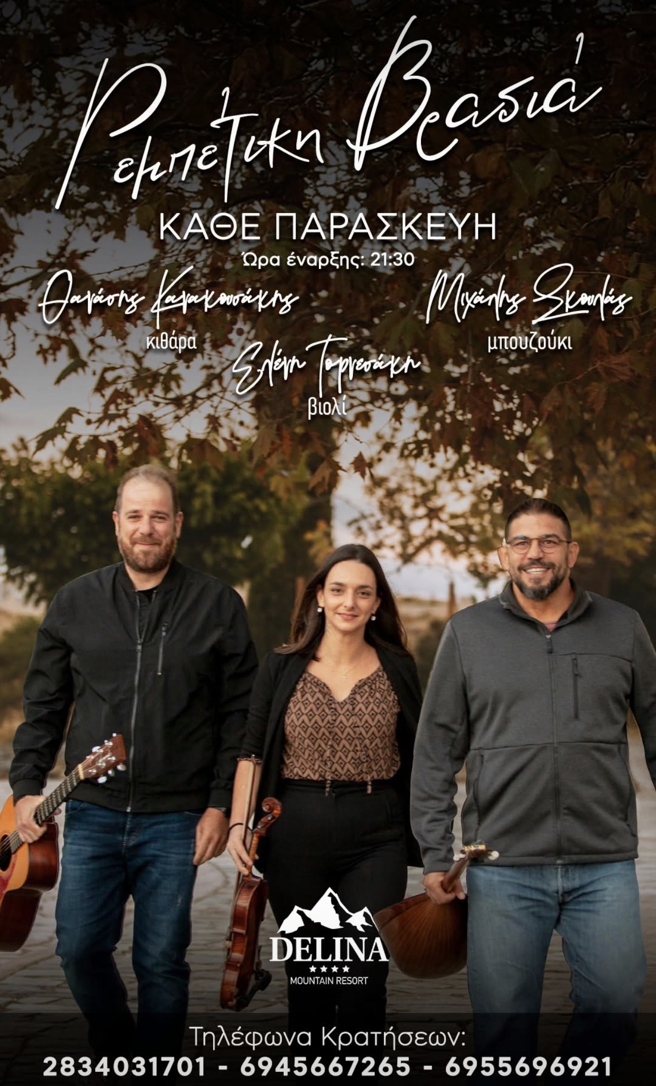Delina Mountain Resort Delina Mountain Resort, Ανώγεια, Ανώγεια, ΕλλάδαΡεμπέτικη βραδιά στην Delina στα Ανώγεια με τους Μιχαλή Σκουλά, Θανάση Κανακουσάκη και Ελένη Τορνεσάκη. Κάθε Παρασκευή στις 21:30. Τηλ. Κρατήσεων 2834031701 & 6945667265.