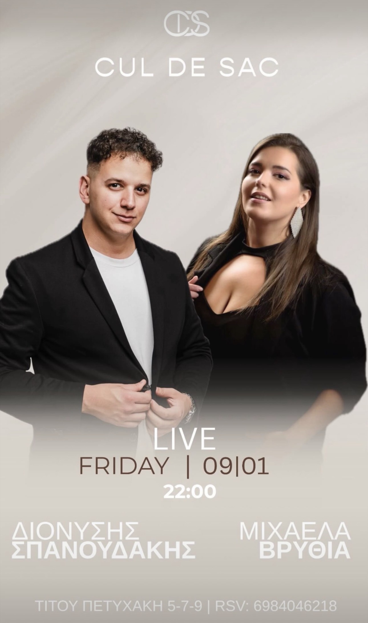 O Διονύσης Σπανουδάκης και η Μιχαέλα Βρυθιά ζωντανά στο Cul De Sac (Τίτου Πετυχάκη 5-9, Παλιά πόλη). Έναρξη 22:00. Τηλ. Κρατήσεων 6984 046218. |