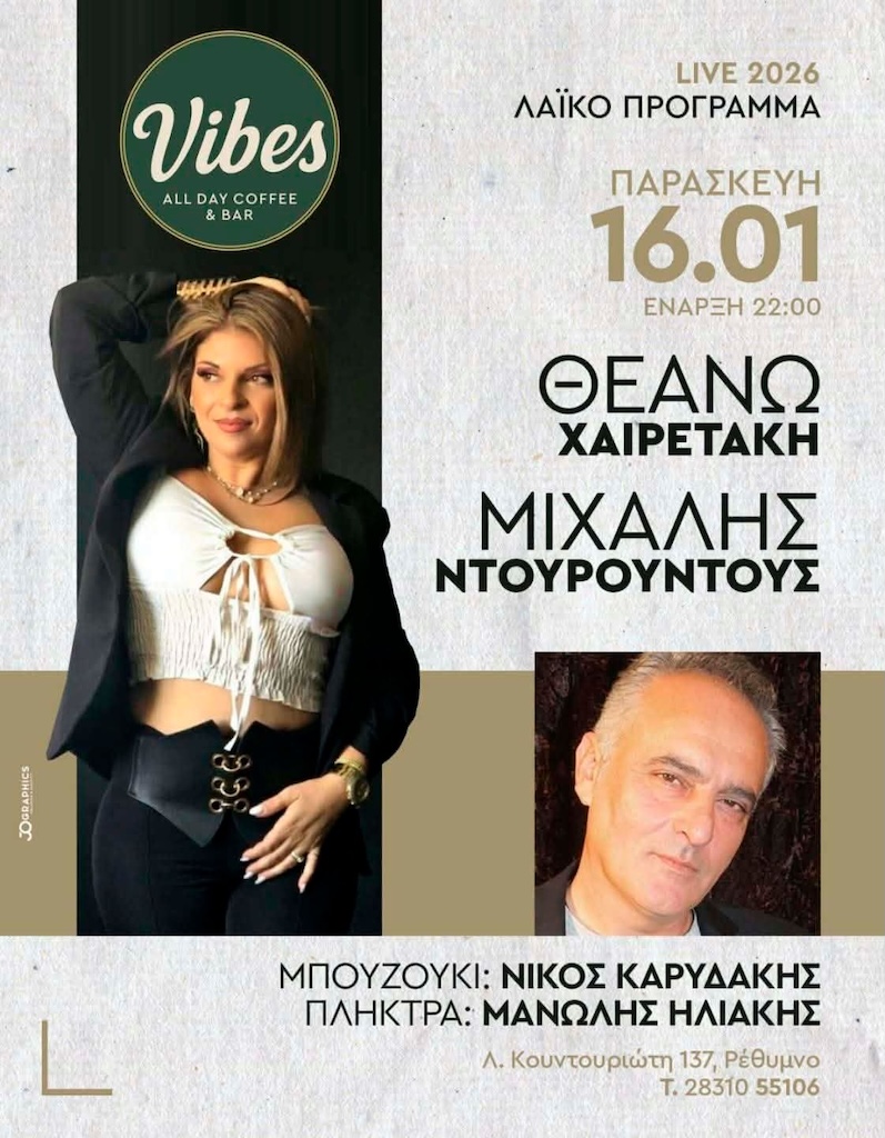 Μουσική βραδιά με τους Λευτέρη Βαμβακά, Χάρη Ανδρεαδάκη, Μανώλη Ηλιάκη και Ραφαέλα Ηγουμενάκη στο Vibes All Day Coffee & Bar (Κουντουριώτου 137, Ρέθυμνο). Σάββατο 10 Ιανουαρίου - Έναρξη 22:00. Τηλ. 2831 055106.