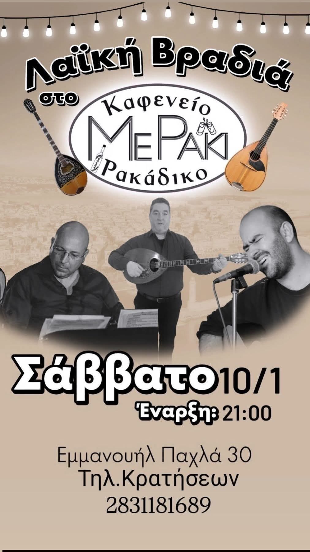 Λαϊκή βραδιά στο Καφενείο «ΜεΡάκι», στα Περιβόλια Ρεθύμνου με το Δημήτρη Ντινιά στο μπουζούκι, το Δημήτρη Τζίμα στην κιθάρα και τον Παύλο Τόμζα στα πλήκτρα. Τηλέφωνο κρατήσεων: 2831 181689.