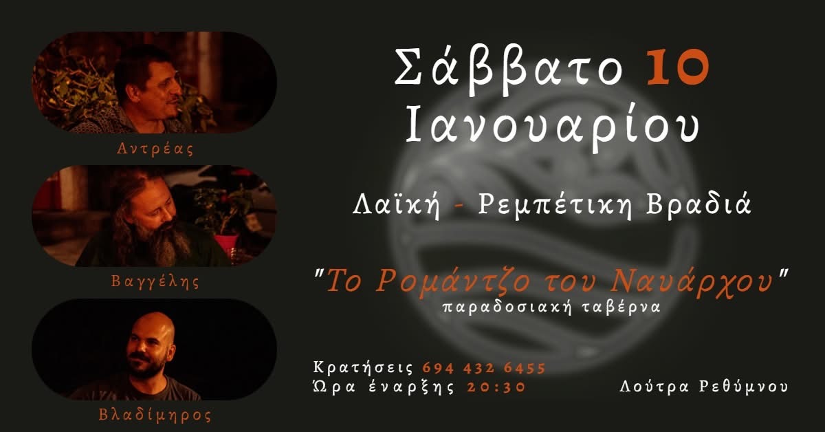 Μουσική βραδιά με λαϊκά και ρεμπέτικα, με τον Ανδρέα, τον Βαγγέλη και τον Βλαδίμηρο στην Ταβέρνα «Το Ρομάντζο του Ναυάρχου» (Λούτρα Ρεθύμνου). Σάββατο 10 Ιανουαρίου - Εναρξη 20:30. Τηλ. 6944 32 6455.
