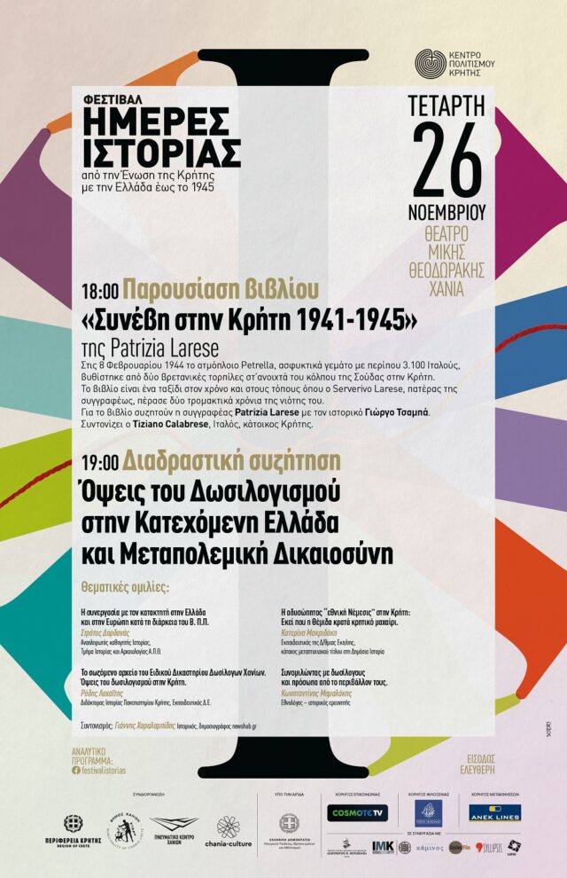Το Φεστιβάλ Ημέρες Ιστορίας (Χανιά από 25-29 Νοεμβρίου), πραγματοποιεί ειδικό αφιέρωμα με θέμα τις Όψεις του Δωσιλογισμού στην Κατεχόμενη Ελλάδα και την Μεταπολεμική Δικαιοσύνη, στο Θέατρο Μίκης Θεοδωράκης, την Τετάρτη 26 Νοεμβρίου στις 19:00, με είσοδο ελεύθερη.