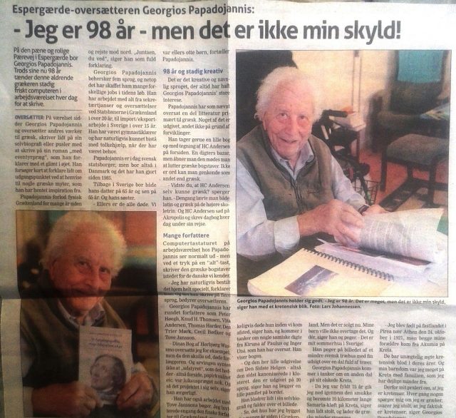 Σας παρουσιάζουμε ένα άρθρο που δημοσιεύθηκε τον Απρίλιο του 2019 στην εφημερίδα NORDSJAELLAND  της Δανίας από τον δημοσιογράφο Sten Kjaersgaard και αφορά έναν συμπατριώτη μας, τον Ρεθεμνιώτη συγγραφέα και μεταφραστή Γιώργο Παπαδογιάννη που ζει στη Δανία και εξακολουθεί παρά τα 98 του χρόνια να παραμένει θαλερός και ακούραστος και να συνεχίζει να γράφει και να μεταφράζει βιβλία* από τα οποία τα περισσότερα έχουν επίκεντρο την αγαπημένη του Κρήτη.