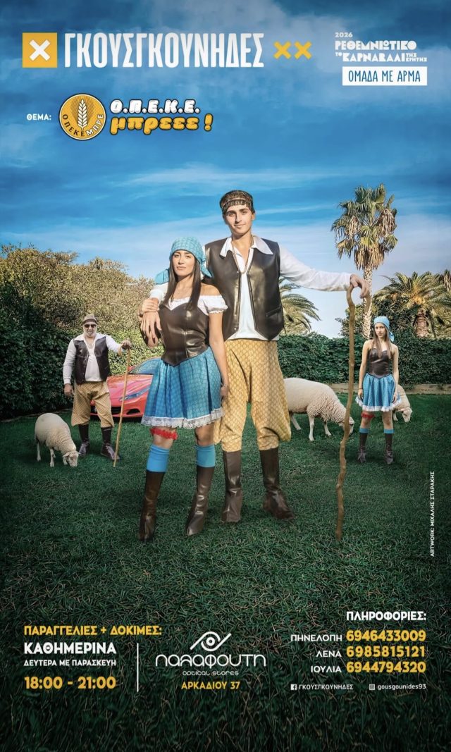 ΚΑΡΝΑΒΑΛΙ ΣΤΟΛΕΣ ΟΜΑΔΩΝ Γκουσγκούνηδες 2026 Ιαν 1, 2026 FacebookTwitterWhatsAppLinkedinViberTelegramEmail Ρεθεμνιώτικο Καρναβάλι 2026 Ομάδα: Γκουσγκούνηδες Θέμα: ΟΠΕΚΕμπρεεε! Τηλ: 6946 433009, 6985 815121, 6944 794320