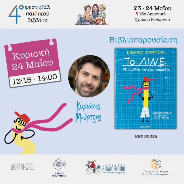 Το 4ο Φεστιβάλ Παιδικού Βιβλίου Ρεθύμνου υποδέχεται ξανά τον Κυριάκο Μούρτζη, συγγραφέα παιδικών βιβλίων και δάσκαλο εικαστικών, ο οποίος επιστρέφει μετά την περσινή του συμμετοχή, αυτή τη φορά με το νέο του βιβλίο και με ακόμη περισσότερες ιστορίες γεμάτες φαντασία και χρώμα.