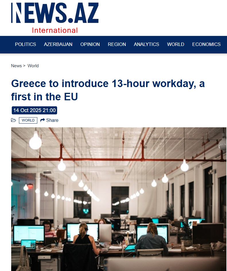 Διεθνή αντίκτυπο έχει το 13ωρο στο νομοσχέδιο του υπουργείου Εργασίας. Τα διεθνή δίκτυα δείχνουν έκπληξη καθώς την ίδια ώρα, άλλες χώρες, συζητάνε (και εφαρμόζουν) το 6ωρο και την 4ήμερη εργασία.