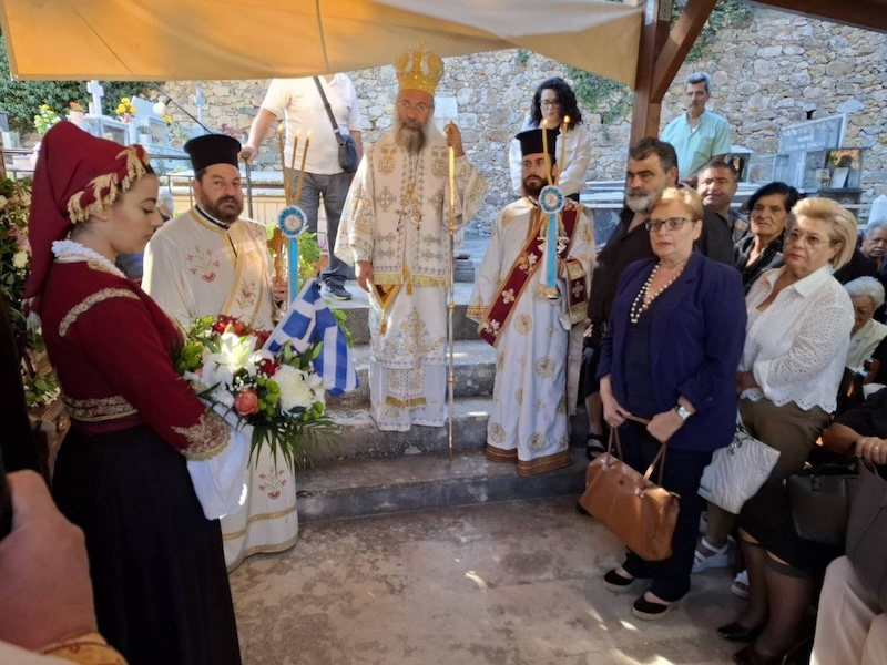 Ο Σεβασμιώτατος, στην προσλαλιά του, αναφέρθηκε στο Πρόσωπο της Υπεραγίας Θεοτόκου, καθώς και στην τιμή προς τους ήρωες που θυσιάστηκαν για την πίστη, την πατρίδα και την ελευθερίας, και συνεχάρη όλους τους παράγοντες του χωριού για την ωραία αυτή ετήσια διοργάνωση, ιδιαιτέρως δε τα παιδιά του Πολιτιστικού Συλλόγου, που με τις κρητικές ενδυμασίες λιτάνευσαν την πρεπιά της Κρήτης.