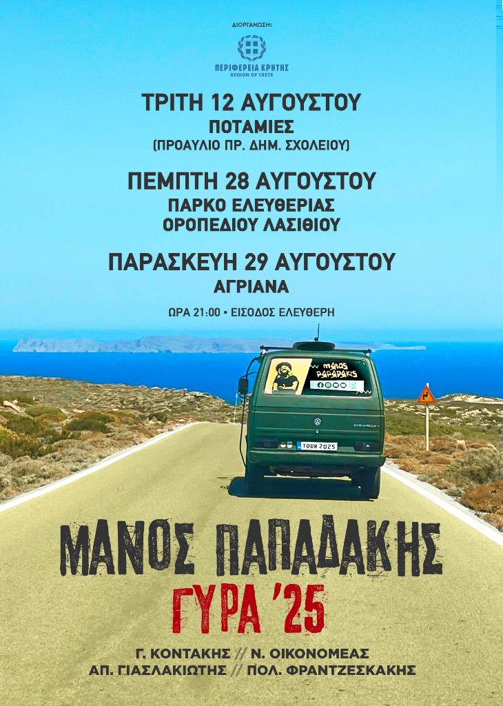 Με το διάσημο πλέον βανάκι του φορτώνει τραγούδια και ενισχυτές και οργώνει την Κρήτη. Κάθε συναυλία του γίνεται σημείο αναφοράς και ένα ταξίδι στον υπέροχο κόσμο της μουσικής. Οι συναυλίες περιλαμβάνουν τραγούδια από τις μέχρι τώρα συνεργασίες του Μάνου Παπαδάκη με γνωστούς συνθέτες και τραγουδοποιούς, καθώς και παλαιότερα αλλά και νέα τραγούδια από τον επερχόμενο δίσκο του, με την πολύτιμη μουσική συντροφιά των εξαιρετικών μουσικών που τον πλαισιώνουν.