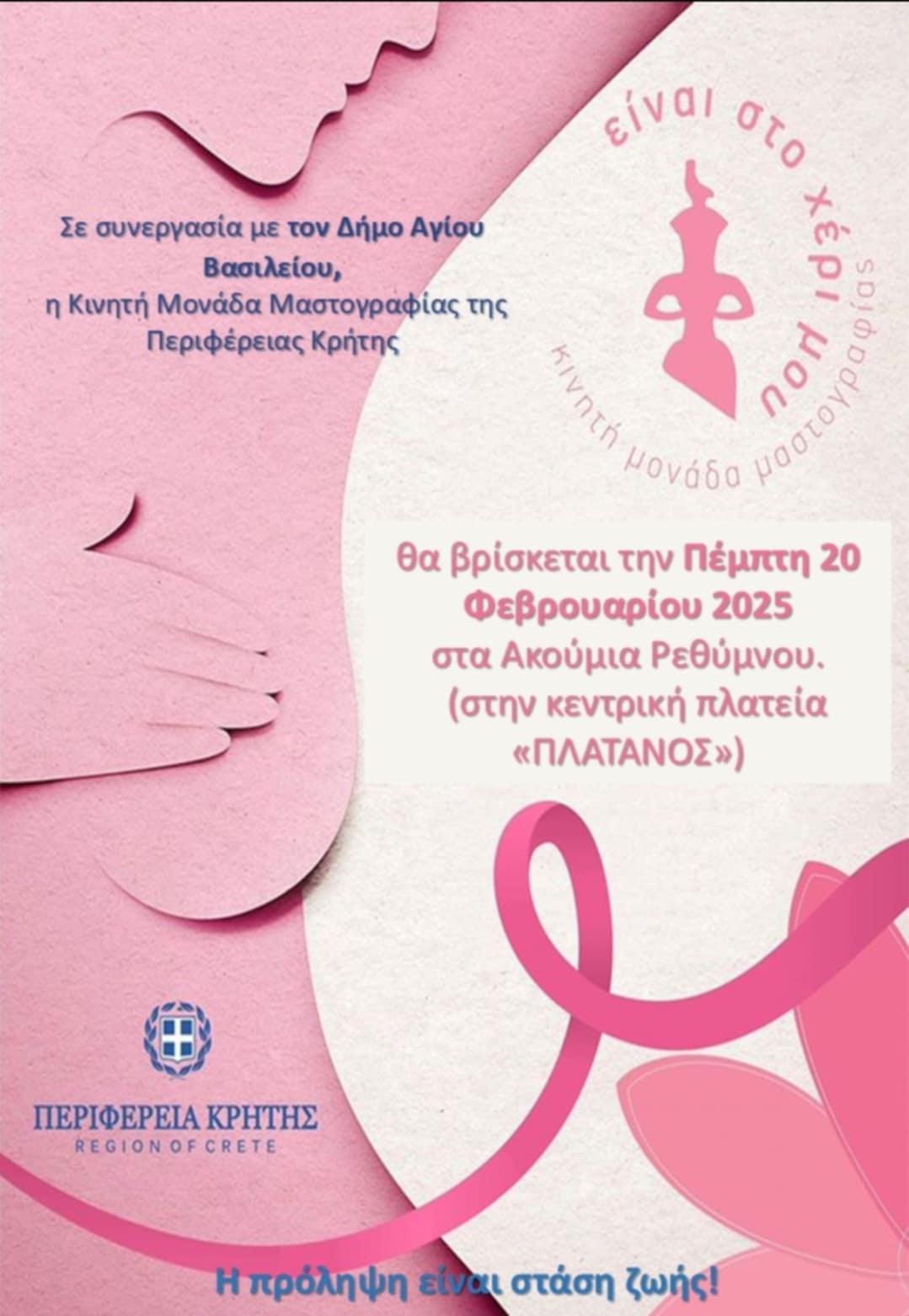 Σε αυτό το πλαίσιο η Κινητή Μονάδα Μαστογραφίας της Περιφέρειας Κρήτης σε συνεργασία με τον Δήμο Αγίου Βασιλείου θα βρεθεί ξανά κοντά μας και συγκεκριμένα: