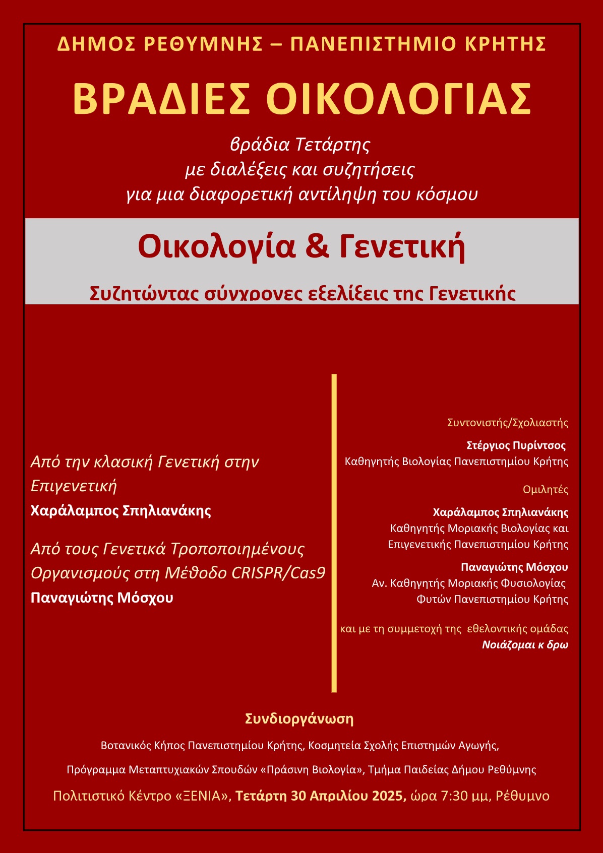 Η «Οικολογία & Γενετική» θα τεθούν στο επίκεντρο των εισηγήσεων και του διαλόγου που θα αναπτυχθεί στις «Βραδιές Οικολογίας» που συνδιοργανώνουν ο Δήμος Ρεθύμνης και το Πανεπιστήμιο Κρήτης, την Τετάρτη 30 Απριλίου 2025, στις 7:30 μμ, Πολιτιστικό Κέντρο «ΞΕΝΙΑ», στο Ρέθυμνο.