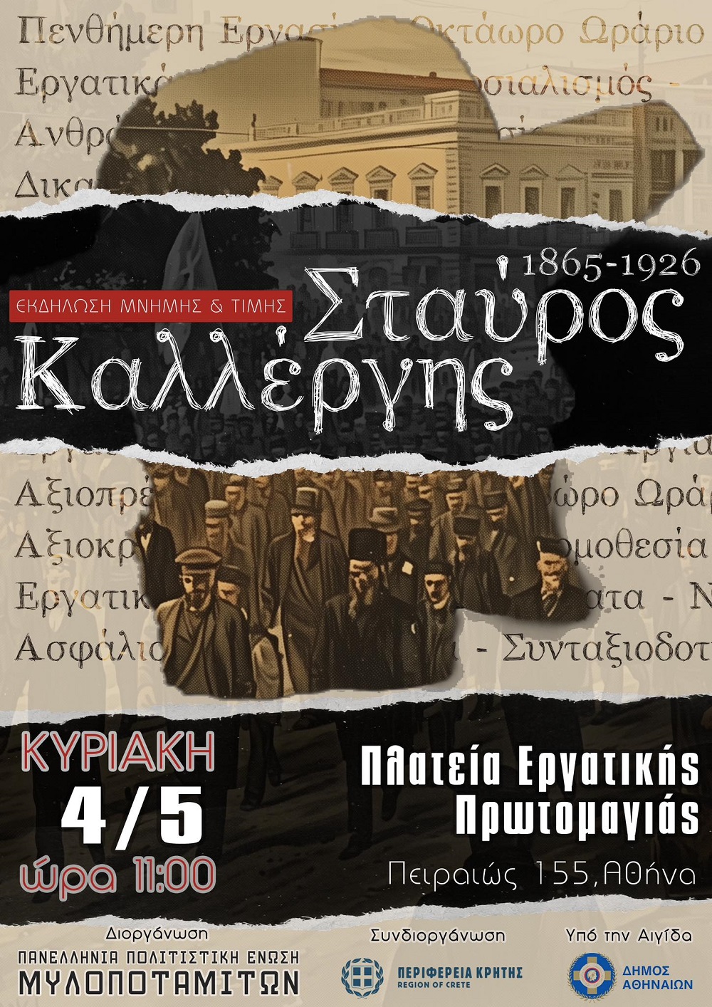 Η Πανελλήνια Πολιτιστική Ένωση Μυλοποταμιτών, σε συνεργασία με την Περιφέρεια Κρήτης και υπό την αιγίδα του Δήμου Αθηναίων, διοργανώνει εκδήλωση τιμής και μνήμης αφιερωμένη στον Έλληνα πρωτοπόρο της Εργατικής Πρωτομαγιάς και πρόδρομο του σοσιαλισμού, Σταύρο Καλλέργη. Η εκδήλωση θα λάβει χώρα την Κυριακή 4 Μαΐου 2025, στις 11:00 π.μ., στην Πλατεία Εργατικής Πρωτομαγιάς (Διασταύρωση οδών Πειραιώς 155 και Πέτρου Ράλλη, Κάτω Πετράλωνα, Αθήνα), όπου και υπάρχει ανδριάντας του.