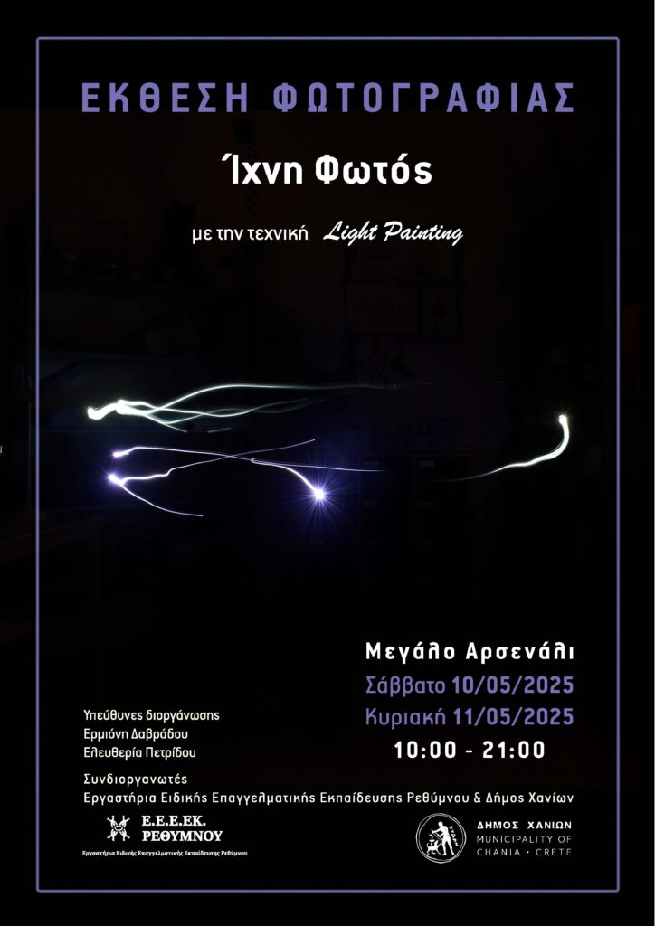 Η ειδικότητα «Τέχνη Φωτογραφίας» της Σ.Α.Ε.Κ. Ρεθύμνου συμμετέχει στην καλλιτεχνική έκθεση φωτογραφίας με τίτλο «Ίχνη Φωτός», η οποία θα φιλοξενηθεί στον εκθεσιακό χώρο “Μεγάλο Αρσενάλι – Κέντρο Αρχιτεκτονικής της Μεσογείου ” στην πόλη των Χανiων, στις 10 και 11 Μαΐου 2025, με ώρες λειτουργίας 10:00 – 21:00.