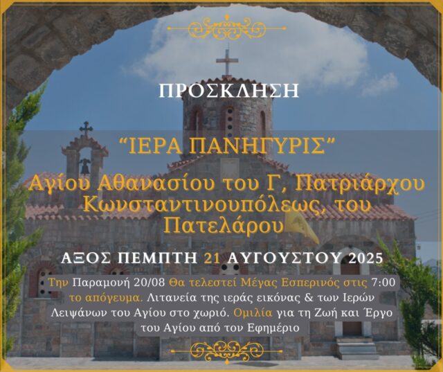 Με ιδιαίτερη χαρά και τιμή, η Ενορία, η Δημοτική Κοινότητα και ο Πολιτιστικός Σύλλογος Αξού – Λιβάδας σας προσκαλούν στην Ιερά Πανήγυρη του τοπικού Αγίου Αθανασίου Γ’ Πατριάρχου Κωνσταντινουπόλεως (Πατελάρου του Αξικού), που θα πραγματοποιηθεί στις 20 & 21 Αυγούστου 2025, στην Αξό Μυλοποτάμου.