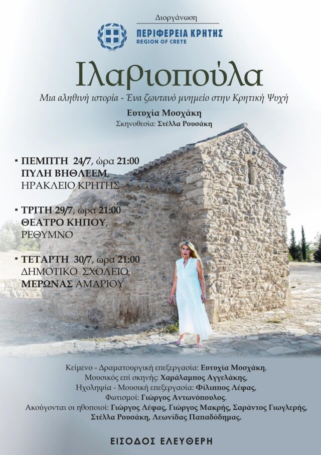 Ένας θεατρικός μονόλογος για την αλησμόνητη Κατερίνα Ιλάριου – Μοσχάκη. Ένα ταξίδι μέσα στον χρόνο, μια αφήγηση-ύμνος στη μνήμη, στη θυσία και στη ρίζα της Κρητικής ψυχής.