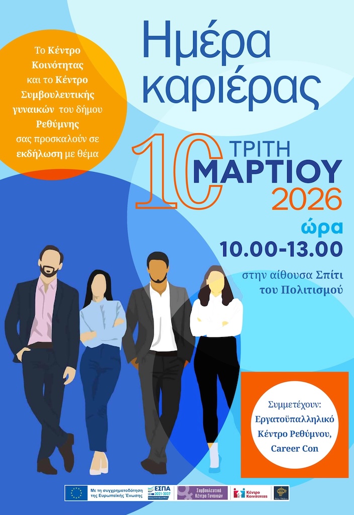 Το Κέντρο Κοινότητας και το Συμβουλευτικό Κέντρο γυναικών του Δήμου Ρεθύμνης σας προσκαλούν στην εκδήλωση που διοργανώνουν με τον τίτλο «Ημέρα Καριέρας», την Τρίτη 10 Μαρτίου, στο Σπίτι του Πολιτισμού, με στόχο την ενίσχυση της απασχολησιμότητας και τη στήριξη των πολιτών στην αναζήτηση εργασίας.