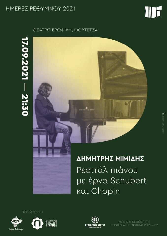 Ο Δημήτρης Μιμίδης ερμηνεύει στο πρώτο μέρος του ρεσιτάλ τον σπουδαίο πιανιστικο κύκλο του Αυστριακού συνθέτη Franz Schubert impromptus op 90. Στο δεύτερο μέρος του ρεσιτάλ θα ακουστούν επιλεγμένα έργα του Πολωνού συνθέτη Freferic Chopin.