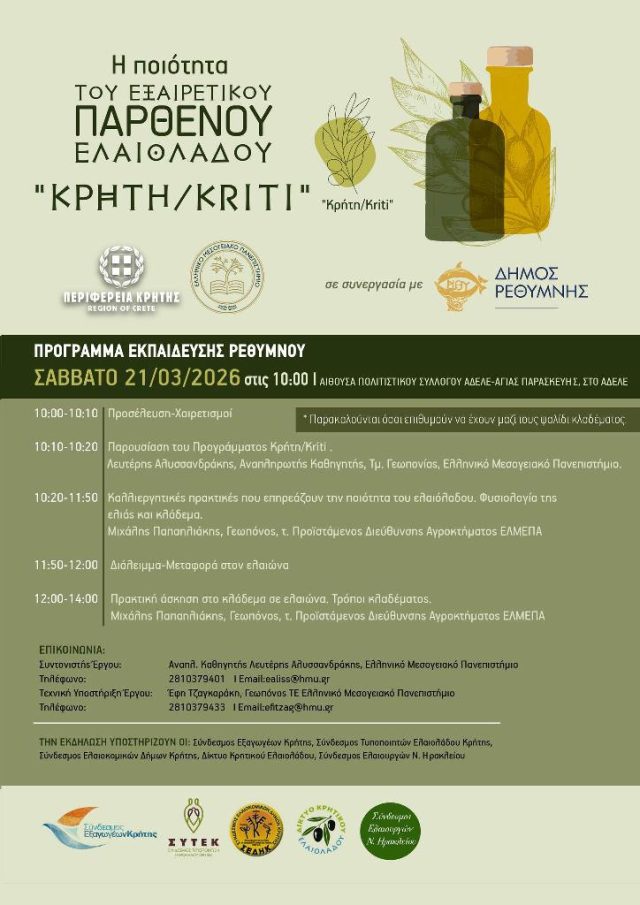 Ανοιχτή πρόσκληση προς τους ελαιοπαραγωγούς και κάθε ενδιαφερόμενο απευθύνουν η Περιφέρεια Κρήτης και το Ελληνικό Μεσογειακό Πανεπιστήμιο, σε συνεργασία με τον Δήμο Ρεθύμνης, για τη συμμετοχή τους σε ενημερωτική και εκπαιδευτική ημερίδα. Στο επίκεντρο της δράσης βρίσκεται η αναβάθμιση της ποιότητας του Εξαιρετικού Παρθένου Ελαιόλαδου “Κρήτη / Kriti”.