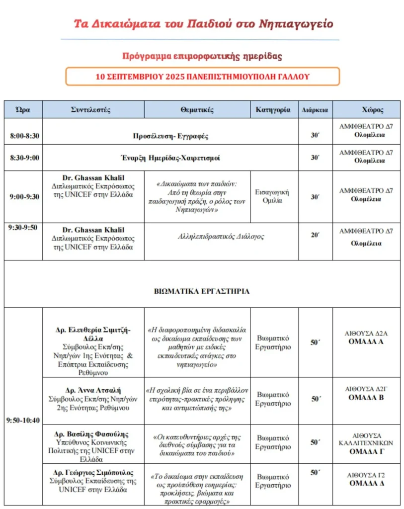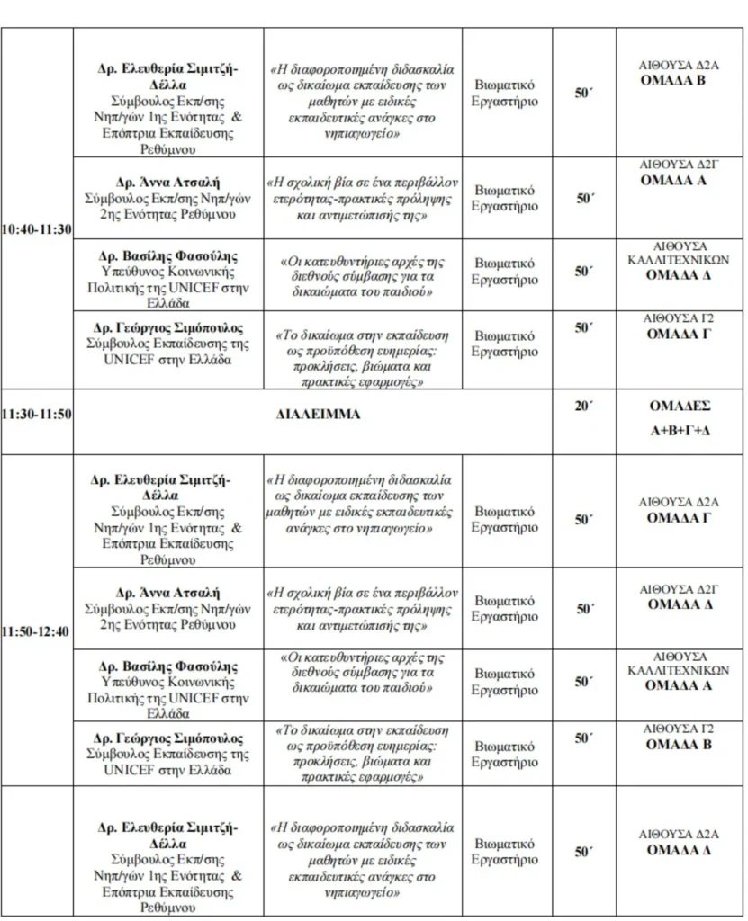 Σε αυτό το πλαίσιο, το Κέντρο για τα Δικαιώματα του Παιδιού του Πανεπιστημίου Κρήτης διοργανώνουν με τις Συμβούλους Εκπαίδευσης 1ης και 2ης Ενότητας Ρεθύμνου, την Διεύθυνση Πρωτοβάθμιας Εκπαίδευσης Ρεθύμνου και τη UNICEF μια σειρά εργαστηρίων σχετικά με τα δικαιώματα του παιδιού, τα οποία επικεντρώνονται στις εξής θεματικές ενότητες: