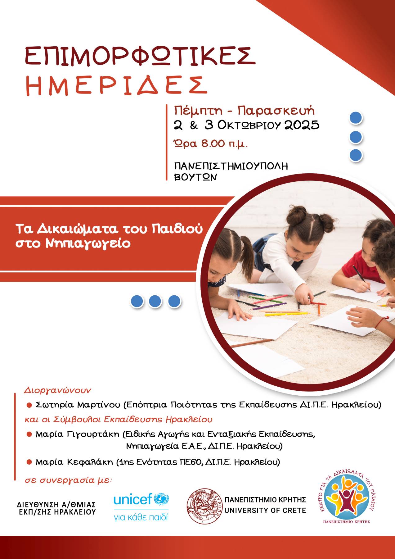 Σε αυτό το πλαίσιο, το Κέντρο για τα Δικαιώματα του Παιδιού του Πανεπιστημίου Κρήτης διοργανώνουν με την Σύμβουλο Εκπαίδευσης 1ης Ενότητας ΠΕ 60 ΔΙ.Π.Ε. Ηρακλείου, την Σύμβουλο Ειδικής Αγωγής και Ενταξιακής Εκπαίδευσης, Νηπιαγωγεία Ε.Α.Ε. ΔΙ.Π.Ε. Ηρακλείου, την Επόπτρια Ποιότητας Εκπαίδευσης ΔΙ.Π.Ε. Ηρακλείου, τη Διεύθυνση Πρωτοβάθμιας Εκπαίδευσης Ηρακλείου και την UNICEF μια σειρά εργαστηρίων σχετικά με τα δικαιώματα του παιδιού, τα οποία επικεντρώνονται στις εξής θεματικές ενότητες: