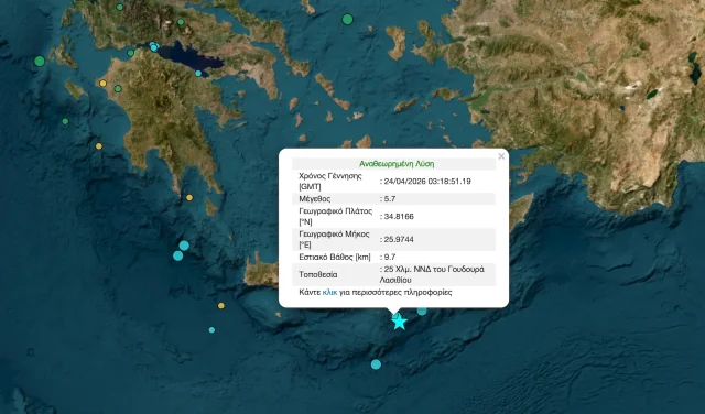 Ισχυρή σεισμική δόνηση μεγέθους 5,7 βαθμών της κλίμακας Ρίχτερ σημειώθηκε το πρωί της Παρασκευής (6:18, 24/4) στη θαλάσσια περιοχή ανοιχτά της Κρήτης, προκαλώντας ανησυχία στους κατοίκους της Ανατολικής Κρήτης.