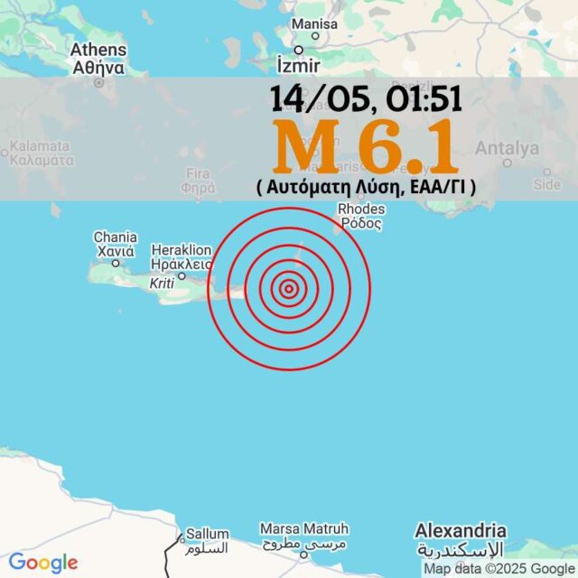 Ισχυρός σεισμός μεγέθους 6.1 βαθμών της κλίμακας Ρίχτερ σημειώθηκε στις 01:51 τα ξημερώματα της Τρίτης 14 Μαΐου, ανατολικά της Κρήτης, σύμφωνα με την αυτόματη λύση του Γεωδυναμικού Ινστιτούτου (ΕΑΑ/ΓΙ).