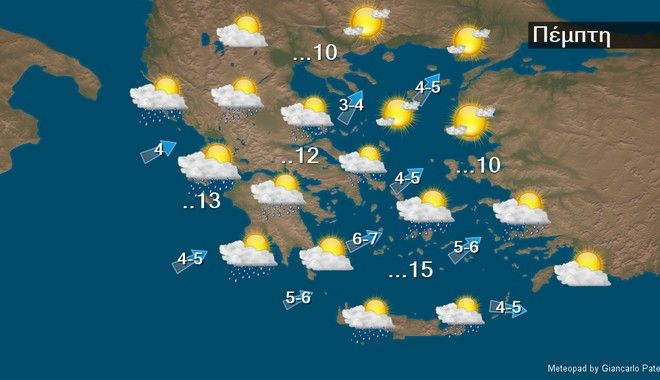 Στις περισσότερες περιοχές προβλέπεται γενικά αίθριος καιρός και μόνο στο Ιόνιο, την Ήπειρο, τη δυτική Στερεά, την Πελοπόννησο, τις Κυκλάδες, την Κρήτη, τα νησιά του ανατολικού Αιγαίου και τα Δωδεκάνησα θα υπάρχουν νεφώσεις κατά διαστήματα αυξημένες, με τοπικές βροχές και λίγα χιόνια στα ορεινά, ενώ από τις βραδινές ώρες τα φαινόμενα στα δυτικά θα ενταθούν. Οι άνεμοι θα πνέουν δυτικοί νοτιοδυτικοί 4 με 5 και βαθμιαία στα πελάγη τοπικά 6 μποφόρ. Στα νοτιοανατολικά μέχρι το μεσημέρι θα πνέουν βορειοδυτικοί 4 με 5 μποφόρ. Η θερμοκρασία θα σημειώσει άνοδο ως προς τις μέγιστες τιμές της και θα φτάσει στα βόρεια τους 10 με 11 βαθμούς και στην υπόλοιπη χώρα τους 13 με 15 βαθμούς Κελσίου. Τις πρωινές και βραδινές ώρες στα κεντρικά και βόρεια ηπειρωτικά θα σημειωθεί κατά τόπους παγετός.