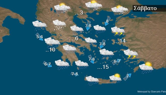 Στα βόρεια προβλέπονται τοπικές νεφώσεις με χιονόνερο ή χιόνι που βαθμιαία θα εξασθενήσουν. Στην υπόλοιπη χώρα προβλέπονται αυξημένες νεφώσεις με βροχές ή χιονόνερο, σποραδικές καταιγίδες στα ανατολικά και νότια θαλάσσια και παραθαλάσσια τμήματα και χιονοπτώσεις στα ορεινά και ημιορεινά αλλά και σε περιοχές της ανατολικής ηπειρωτικής χώρας με χαμηλό υψόμετρο. Τα φαινόμενα, που πιθανώς στα ανατολικά να είναι πρόσκαιρα ισχυρά, από το απόγευμα στα δυτικά θα εξασθενήσουν. Οι άνεμοι θα πνέουν από βόρειες διευθύνσεις 5 με 7 και βαθμιαία στο Ιόνιο και πιθανώς στο Αιγαίο τοπικά 8 μποφόρ, και μόνο στην Κρήτη και τα Δωδεκάνησα θα πνέουν αρχικά δυτικοί 5 με 6 μποφόρ που βαθμιαία θα στραφούν σε βόρειους βορειοδυτικούς και θα ενισχυθούν. Η θερμοκρασία θα σημειώσει αισθητή πτώση, της τάξεως των 5 με 8 βαθμών, κυρίως στα δυτικά, τα κεντρικά και τα βόρεια και θα κυμανθεί σε χαμηλά επίπεδα. Παγετός θα σημειωθεί στα ηπειρωτικά, ο οποίος τις βραδινές ώρες στα κεντρικά και βόρεια θα είναι κατά τόπους ισχυρός.