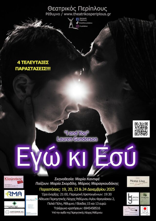 Ώρες έναρξης: 21.00 (εκτός από την Τετάρτη 24/12 που η παράσταση ξεκινά στις 19.30) στην Αίθουσα Περιηγητικής Λέσχης Ρεθύμνου (Αγ. Φραγκίσκου 2, παλιά πόλη)