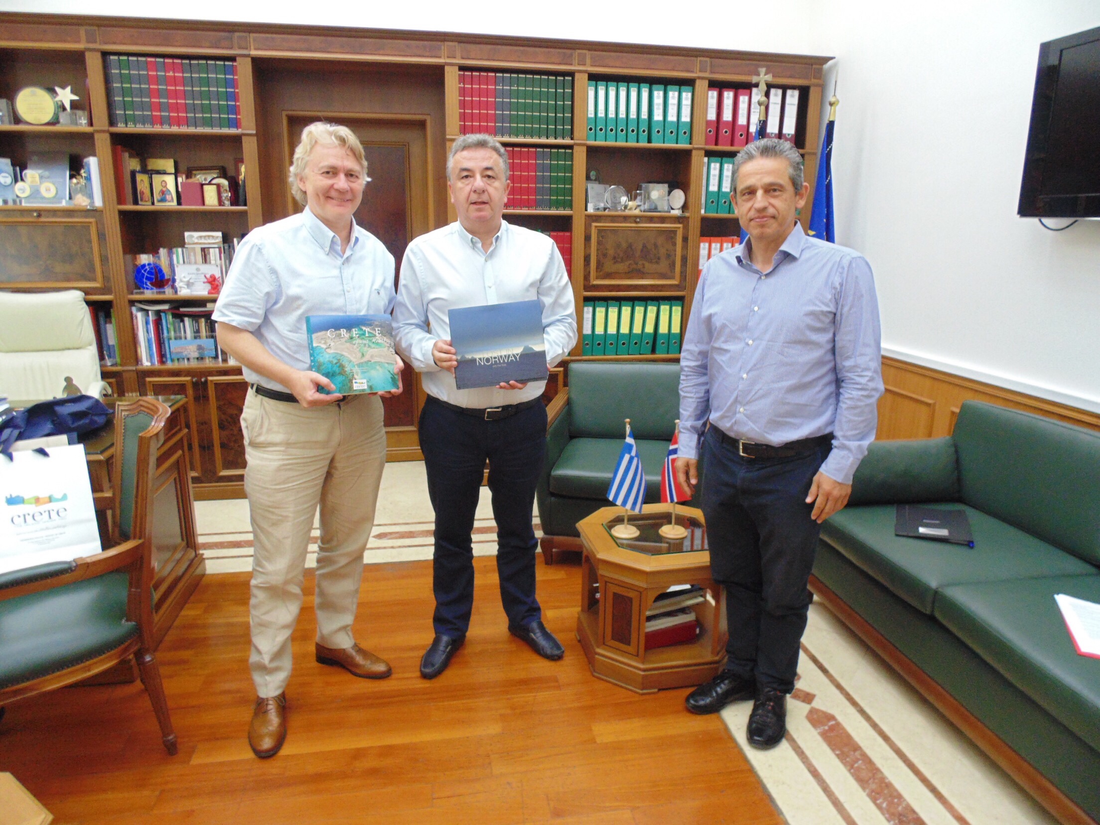 Την ανάπτυξη χρηματοδοτικών-αναπτυξιακών δράσεων στη Κρήτη μέσω του προγράμματος ΕΟΧ (eea Grand) που διαχειρίζεται η Νορβηγία με προϋπολογισμό για όλη την Ελλάδα 125 εκ. ευρώ, συζήτησαν ο Περιφερειάρχης Κρήτης Σταύρος Αρναουτάκης και ο Νορβηγός Πρέσβης στην Αθήνα Jørn Gjelstad που επισκέφθηκε σήμερα την Περιφέρεια Κρήτης.