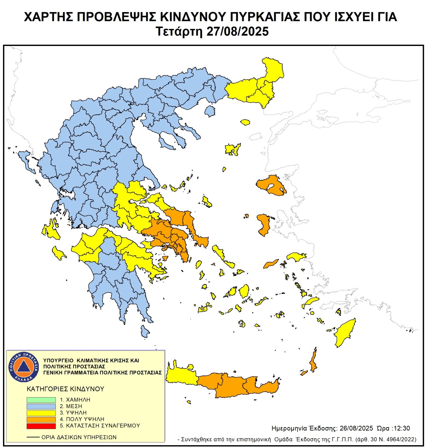 Η Πολιτική Προστασία Περιφέρειας Κρήτης ενημερώνει ότι, σύμφωνα με τον ημερήσιο Χάρτη Πρόβλεψης Κινδύνου Πυρκαγιάς της Γενικής Γραμματείας Πολιτικής Προστασίας, για αύριο Τετάρτη 27 Αυγούστου 2025 στην Π.Ε. Λασιθίου, Π.Ε. Ηρακλείου & Π.Ε. Ρεθύμνου Κρήτης η κατηγορία Κινδύνου Πυρκαγιάς, είναι κατηγορίας κινδύνου 4 (πολύ υψηλός).