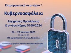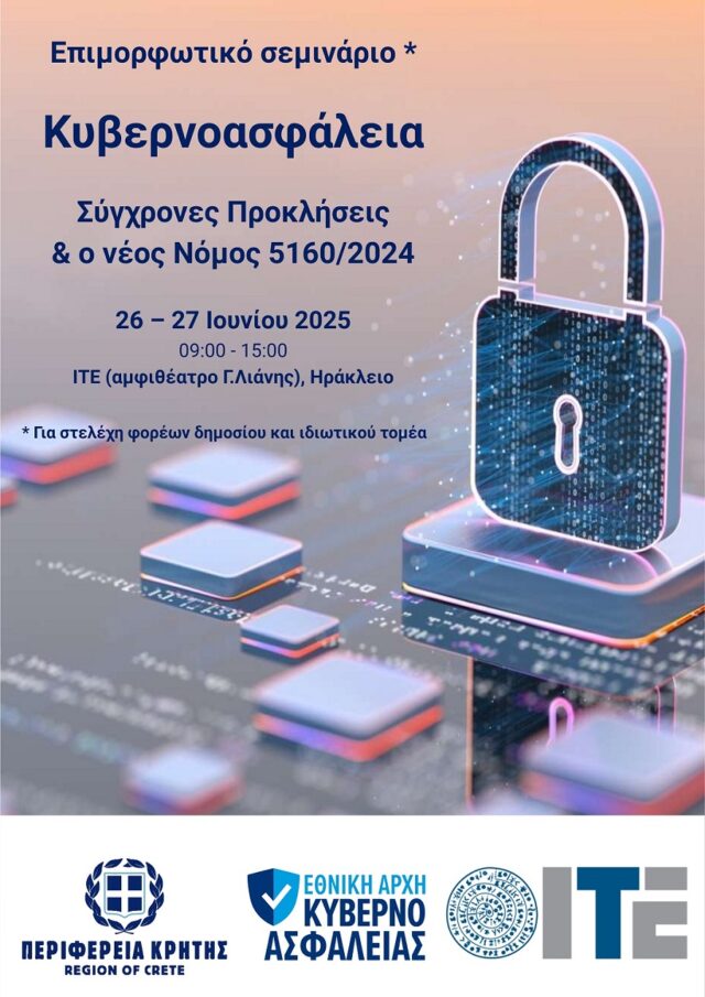 Η Περιφέρεια Κρήτης σε συνεργασία με την Εθνική Αρχή Κυβερνοασφάλειας και το Ίδρυμα Τεχνολογίας και Έρευνας διοργανώνουν, διήμερο επιμορφωτικό σεμινάριο με θέμα «Κυβερνοασφάλεια: Σύγχρονες Προκλήσεις και ο Νέος Νόμος 5160/2024», στις 26 και 27 Ιουνίου, στο Ηράκλειο.