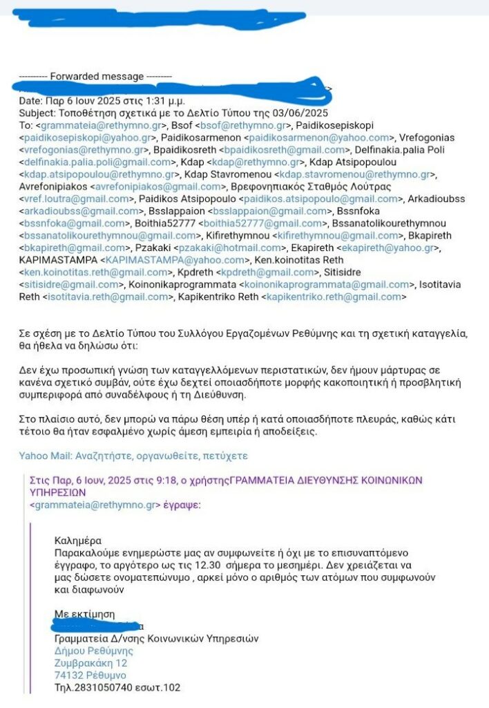 Μόλις 3 μέρες μετά την ανακοίνωση του ΔΣ του συλλόγου εργαζομένων,  από το email της Διεύθυνσης Κοινωνικών Υπηρεσιών αποστέλλεται σε 17 δομές της υπηρεσίας μήνυμα-απάντηση στον σύλλογο.  Καλεί (τις προϊσταμένες προφανώς) να δηλώσουν πόσοι από τους εργαζόμενους συμφωνούν με την ανακοίνωση του σωματείου τους και πόσοι με το (απαράδεκτο) κείμενο που διαβιβάζουν. Δίνουν δηλ εντολή και στις προϊσταμένες  να προβούν και αυτές σε ωμή κατάχρηση εξουσίας ζητώντας από  τους εργαζόμενους δηλώσεις για θέματα  προσωπικής – συνδικαλιστικής συνείδησης (ευαίσθητα προσωπικά δεδομένα δηλαδή) επι των οποίων η υπηρεσία όχι δεν έχει καμιά αρμοδιότητα αλλά ΑΠΑΓΟΡΕΥΕΤΑΙ ΡΗΤΑ να εμπλέκεται και να ελέγχει!!!