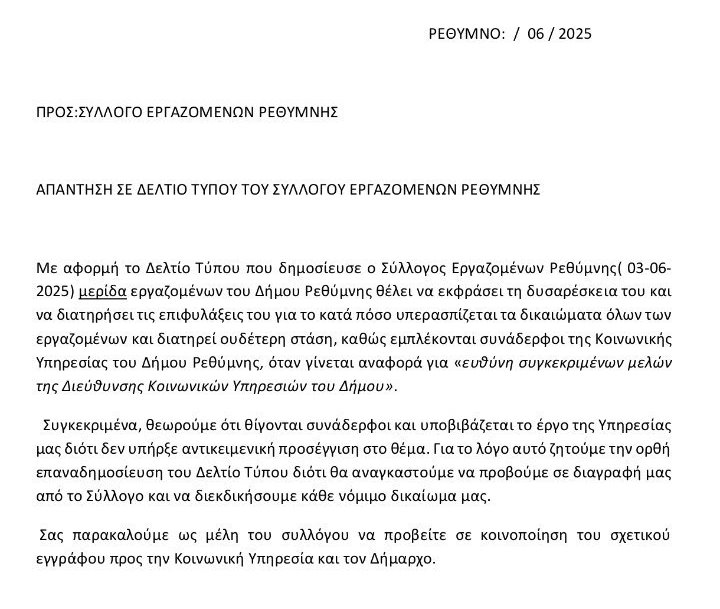 Λαϊκή Συσπείρωση Ρεθύμνου: Απτόητη στην κατάχρηση εξουσίας η Διεύθυνση Κοινωνικών Υπηρεσιών του Δήμου Ρεθύμνου