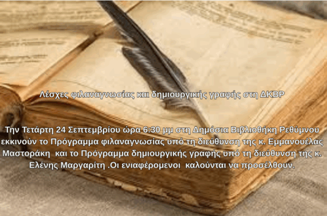 Την Τετάρτη 24 Σεπτεμβρίου ώρα 6:30 μ.μ. στη Δημόσια Βιβλιοθήκη Ρεθύμνου εκκινούν το πρόγραμμα φιλαναγνωσίας υπό τη διεύθυνση της κ. Εμμανουέλας Μαστοράκη (κιν. 6980609539) και το πρόγραμμα δημιουργικής γραφής υπό τη διεύθυνση της κ. Ελένης Μαργαρίτη (κιν. 6973334797).