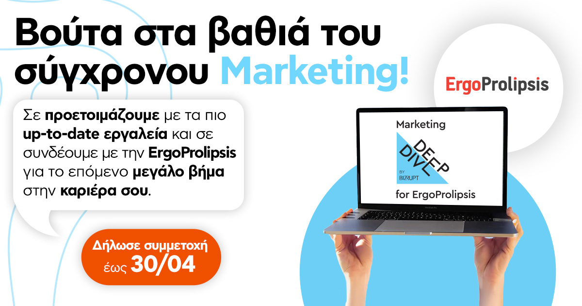 Το Bizrupt και η ErgoProlipsis ανακοινώνουν την έναρξη του προγράμματος Marketing Deep Dive”, μια στρατηγική συνεργασία που αποσκοπεί στην ουσιαστική διασύνδεση της εκπαίδευσης με την αγορά εργασίας. Το πρόγραμμα αποτελεί μια πρωτοβουλία Εταιρικής Κοινωνικής Ευθύνης (CSR) της ErgoProlipsis, σχεδιασμένη και υλοποιημένη από την ομάδα του Bizrupt.
