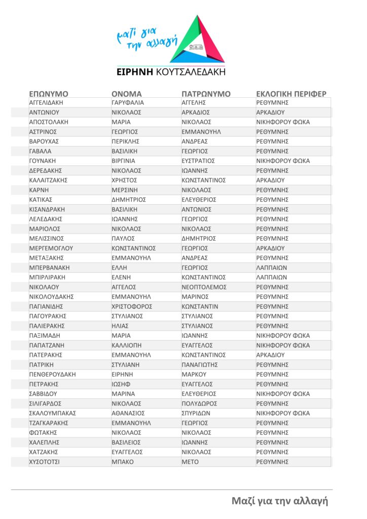 «ΜΑΖΙ ΔΥΝΑΤΑ ΓΙΑ ΤΗΝ ΑΛΛΑΓΗ»: Κατατέθηκε το ψηφοδέλτιο του συνδυασμού της Ρένας Κουτσαλεδάκη για το Δήμο Ρεθύμνου