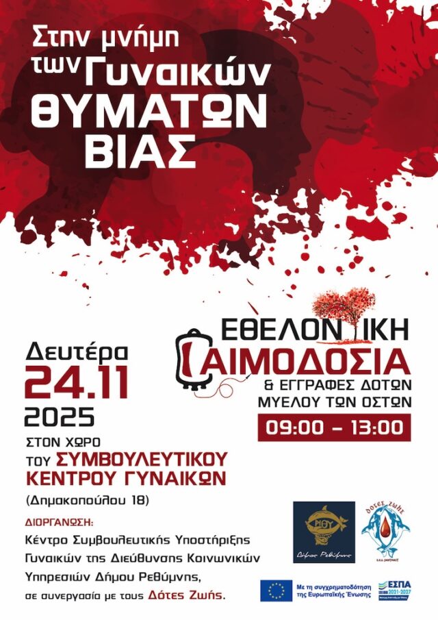 – Τη Δευτέρα 24 Νοεμβρίου 2025, από τις 9 το πρωϊ έως τη μία ο μεσημέρι, θα διενεργηθεί εθελοντική αιμοδοσία και εγγραφές δοτών μυελού των οστών. Η δράση θα πραγματοποιηθεί σε συνεργασία με το Σύλλογο Εθελοντών Αιμοδοτών Ν. Ρεθύμνου «Δότες Ζωής», στο χώρο του Συμβουλευτικού Κέντρου Γυναικών (οδός Δημακοπούλου 18,Τηλ: 2831056607).
