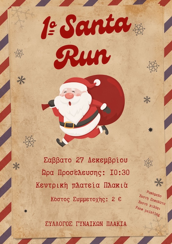 Οι γιορτινές δράσεις θα συνεχιστούν, με το πρώτο Santa Run Πλακιά, που θα πραγματοποιηθεί την Κυριακή 27 Δεκεμβρίου στις 10:30.