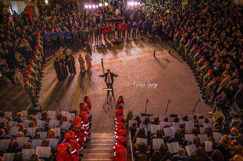 Κεντρικό σημείο της βραδιάς αποτέλεσε η συνάντηση τεσσάρων Επιταφίων, από την Κυρία των Αγγέλων, την Αγία Βαρβάρα, τον Άγιο Κωνσταντίνο και τους Τέσσερις Μάρτυρες, δημιουργώντας μια ιδιαίτερα κατανυκτική ατμόσφαιρα στο κέντρο της πόλης.