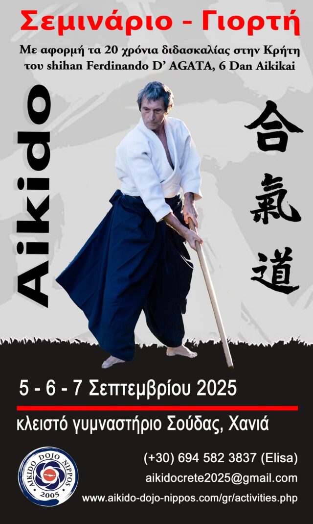 Η καρδιά του Aikido, της πολεμικής τέχνης που διδάσκει όχι μόνο αυτοάμυνα αλλά και φιλοσοφία ζωής, θα χτυπά δυνατά στα Χανιά το τριήμερο 5, 6 και 7 Σεπτεμβρίου 2025, με αφορμή τη συμπλήρωση 20 ετών διδασκαλίας Aikido στην Κρήτη από τον Shihan Ferdinando D’ Agata, 6 Dan Aikikai.