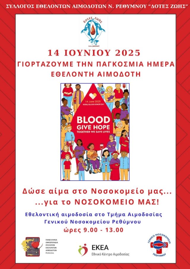 Ο Σύλλογος Εθελοντών Αιμοδοτών Ν. Ρεθύμνου «ΔΟΤΕΣ ΖΩΗΣ» σας προσκαλεί να γιορτάσουμε μαζί την Παγκόσμια Ημέρα Εθελοντή Αιμοδότη, όχι με λόγια, αλλά με πράξεις αγάπης και ζωής.
