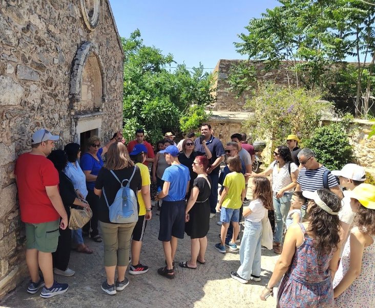 Η κυρία Μαρία Δαμιανάκη μας ξενάγησε στον βυζαντινό ναό του Αγίου Γεωργίου, ενώ οι κυρίες του Πολιτιστικού Συλλόγου Αποστολιανών, τράταρε τους μουσαφίρηδες μας το πιο γλυκό έθιμο της Πεδιάδας, τις ζαχαρωτές μαντινάδες.
