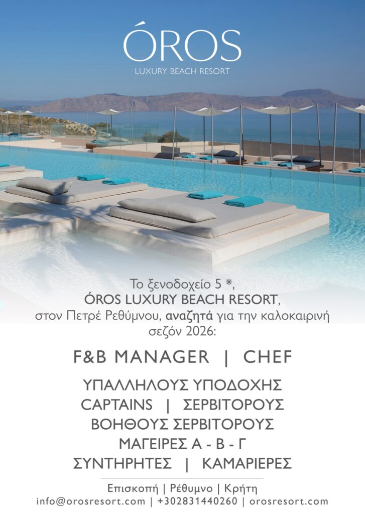 Ζητείται καμαριέρα, κοπέλα για πρωινό μπουφέ, για σεζόν 2025 από τουριστικό κατάλυμα στο Πάνορμο Ρεθύμνου. Απαραίτητη η γνώση της Αγγλικής γλώσσας. Επιθυμητά προσόντα: όρεξη για δουλειά, υπευθυνότητα, αξιοπιστία, ευγένεια. Αποστολή βιογραφικών με  φωτογραφία info@marelina-villas.gr.