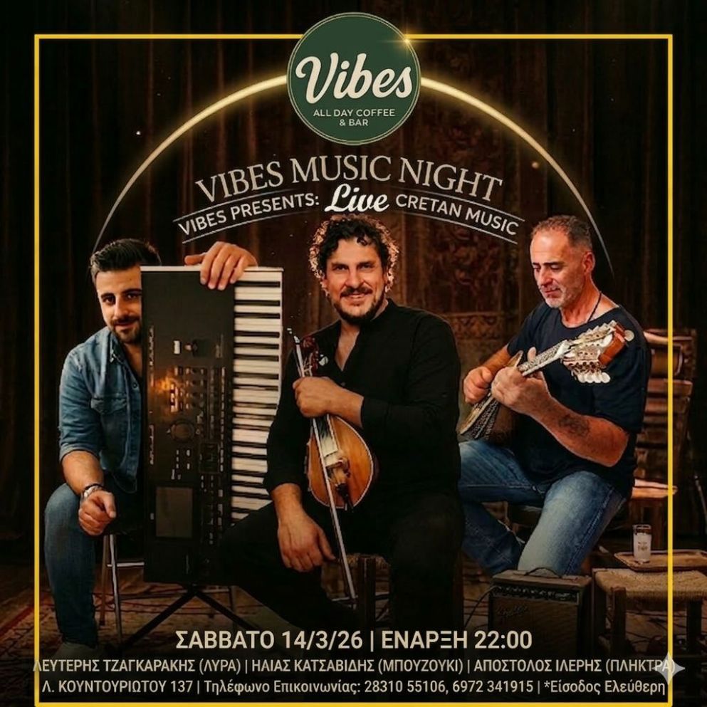 ΕΙΔΗΣΕΙΣ ΠΟΛΙΤΙΣΜΟΣ Μουσική βραδιά στο Vibes All Day Coffee & Bar Μαρ 11, 2026 FacebookTwitterWhatsAppLinkedinViberTelegramEmail Μουσική βραδιά με τον Λευτέρη Τζαγκαράκη, τον Αποστόλη Ιλερή και τον Ηλία Κατσαβίδη στο Vibes All Day Coffee & Bar Σάββατο 14/03/2026 – Έναρξη 22:00. Τηλ. κρατήσεων: 28310 55106 – 6972 341915 Είσοδος ελεύθερη.