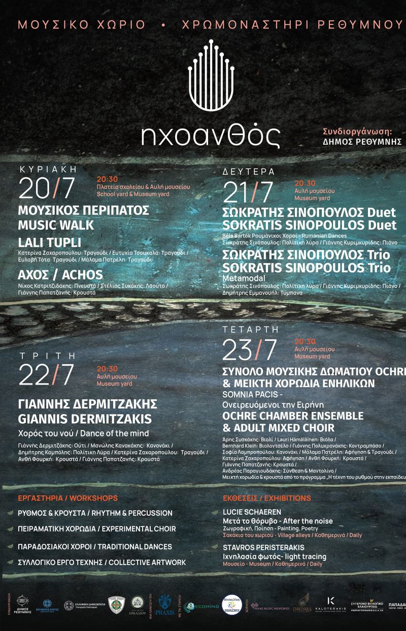 Με μεγάλη μας χαρά σας παρουσιάζουμε το πρόγραμμα του φετινού καλοκαιρινού φεστιβάλ ΗΧΟΑΝΘΟΣ στο Χρωμοναστήρι Ρεθύμνου.