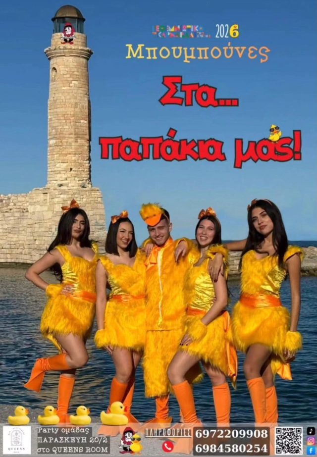 ΚΑΡΝΑΒΑΛΙ ΣΤΟΛΕΣ ΟΜΑΔΩΝ Μπουμπούνες 2026 Ιαν 6, 2026 FacebookTwitterWhatsAppLinkedinViberTelegramEmail Ρεθεμνιώτικο Καρναβάλι 2026 Ομάδα Μπουμπούνες Θέμα: «Στα …παπάκια μας» Τηλ: 69722 09908, 69845 80254