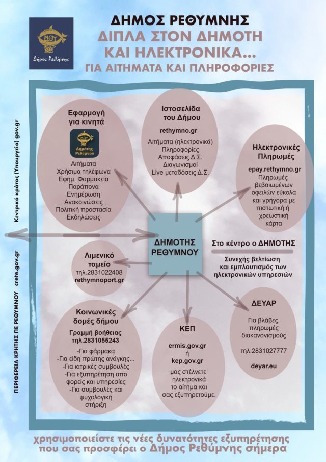 Ο Δήμος Ρεθύμνης και οι υπηρεσίες του, προσανατολίζονται σταθερά στην ενθάρρυνση της χρήσης των ψηφιακών δυνατοτήτων εκ μέρους των δημοτών και μετά τη λήξη της δύσκολης περιόδου που βιώνουμε. Έχει σημασία να γίνει απ όλους αντιληπτό πως η ορθολογική αξιοποίηση των διευκολύνσεων που παρέχει η σύγχρονη τεχνολογία τη διεκπεραίωση καθημερινών υποθέσεων, αφενός θα απαλλάξει τους πολίτες από το άγχος και την απώλεια πολύτιμου χρόνου που σπαταλούν σε μετακινήσεις και αναμονή στις υπηρεσίες και αφετέρου, θα προσφέρει ευελιξία και ταχύτητα στη λειτουργία των ίδιων των υπηρεσιών αφού θα συρρικνωθεί ο χρόνος της αυτοπρόσωπης συνδιαλλαγής με το κοινό.
