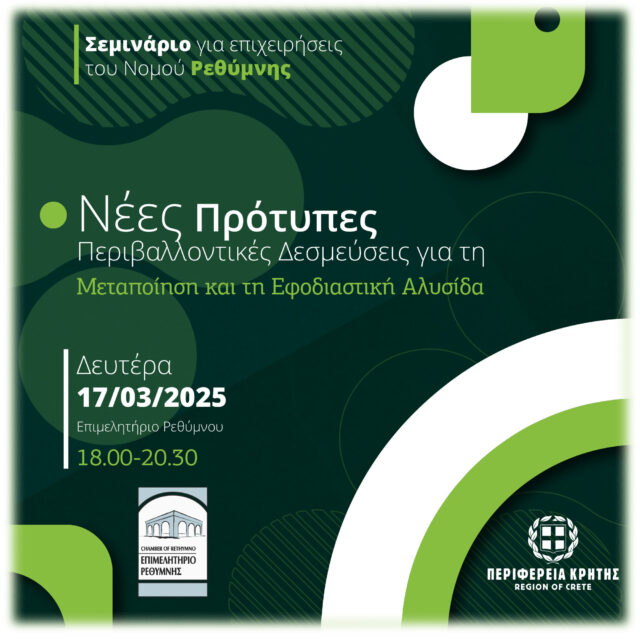 Με στόχο την ενημέρωση των επιχειρήσεων του Ρεθύμνου σχετικά με τις αλλαγές που σημειώνονται στον τρόπο με τον οποίο αδειοδοτούνται και λειτουργούν, η Περιφέρεια Κρήτης και το Επιμελητήριο Ρεθύμνης οργανώνουν ειδική σεμιναριακή εκδήλωση με τίτλο: «Νέες Πρότυπες Περιβαλλοντικές Δεσμεύσεις για τη μεταποίηση και την εφοδιαστική αλυσίδα», η οποία θα πραγματοποιηθεί τη Δευτέρα  17 Μαρτίου 2025 και ώρα 18:00, στην αίθουσα εκδηλώσεων του Επιμελητηρίου Ρεθύμνης, Εμμ. Πορτάλιου 23, 1ος  όροφος.